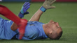 Slow motion shot that zooms in on adult male international football goalie laying on his back with his hands over his face seeming distraught and disappointed after his soccer team lost the championship game