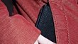 Human hand putting leather wallet in pocket of rusty corduroy jacket with copper buttons. Close-up