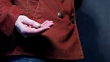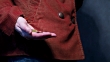 Small change in human hand holding it near the pocket of rusty corduroy jacket