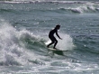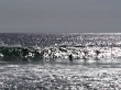 One continuous shot of a surfer backlit by the sun, ending in the surfer dropping into the water.