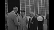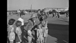 Thunderbirds (F-84 Thunderjet) precision flight over field / pan air craft on tarmac, people walking around them / VS Jimmy Stewart stoops to sign autographs for circle of children / ext a hangar General Curtis E LeMay, US Strategic Air Command, and Lt General James Doolittle talking as Stewart walks up to shake hands / CU pan as they talk