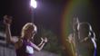 Slow motion medium shot of two adult women athletes cheerfully greeting the other on the field after a track and field race and enthusiastically hugging to congratulate each other