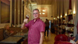 Video portrait of a cheerful man in his late 50s raising a glass and taking a drink in an elegant wine tasting lounge in Northern California, with other patrons drinking and chatting in the background.