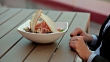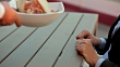 Waiter serving bowl of fresh salad with prosciutto and toasted bread, woman then start to eat salad