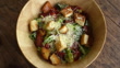 Cuenco de madera relleno de ensalada César, verduras verdes frescas, queso parmesano y picatostes crujientes, concepto de comida dietética saludable - Vídeo de stock 4K