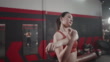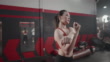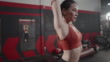 Joven deportista asiática en ropa deportiva, estira los músculos y el cuerpo, calienta antes de hacer ejercicio o refréscate en el gimnasio. La mujer es entrenamiento de práctica en fitness para un cuerpo sano. Deporte, salud, estilo de vida de las per - Vídeo de stock 4K