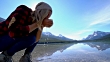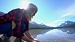 Blond girl drinking fresh water from mountain lake in Banff national park, Alberta, Canada. People travel nature environment concept- 4K